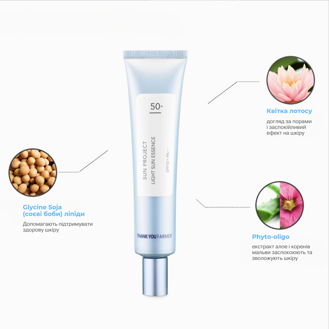 THANK YOU FARMER Sun Project Light Sun Essence SPF50+ PA+++ — протисонцевий засіб широкого спектра дії на хімічних фільтрах з надлегкою невагомою текстурою.